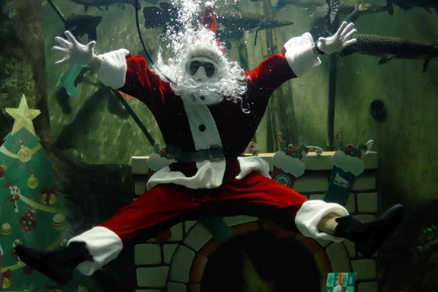 A diver dressed as Santa Claus gestures as he swims in a fish tank at the Guadalajara Zoo's Aquarium ahead of Christmas, in Guadalajara, Mexico, December 21, 2024. Reuters