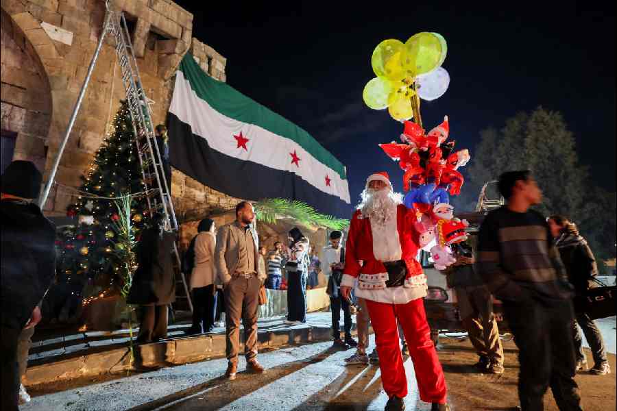 A Syrian man dressed as Santa Claus walks with ballons next to Christmas tree and a flag adopted by the new Syrian rulers at Bab Touma, a predominantly Christian neighbourhood, after the ousting of Syria's Bashar al-Assad, in Damascus, Syria, December 22, 2024. Reuters