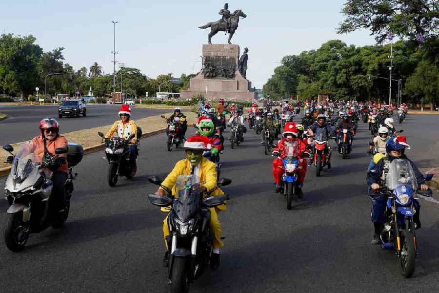 People dressed as Santa Claus and in other costumes ride motorcycles before delivering gifts to hospitalized children in Buenos Aires, Argentina, December 21, 2024. Reuters