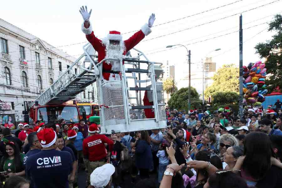 A firefighter dressed as Santa Claus greets people during Christmas season celebrations in Valparaiso, Chile December 21, 2024. Reuters