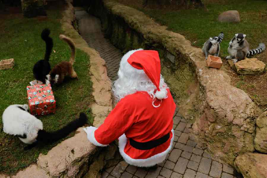 Javier Vicent, 49, a caretaker dressed up as Santa Claus, watches the familiy of lemurs after he placed Christmas boxes with food as gifts in their enclosure, during an event which combines the magic of Christmas with the commitment to animal welfare, at Bioparc Fuengirola, in Fuengirola, Spain, December 21, 2024. Reuters