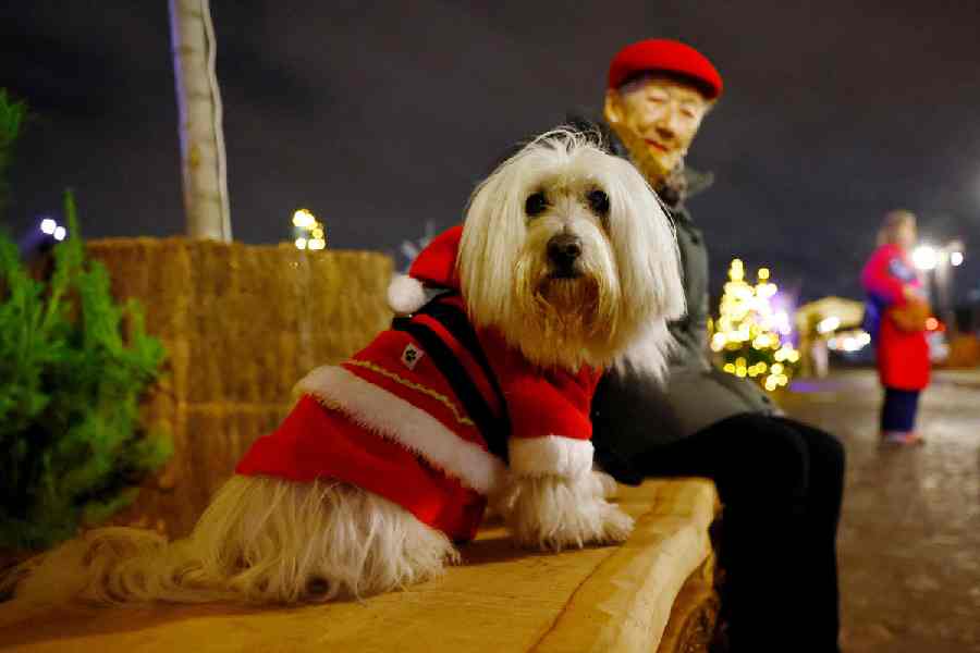 A dog dressed in a Santa Claus costume sits on a bench at the Christmas market of the Place de la Concorde in Paris, France, December 18, 2024. Reuters