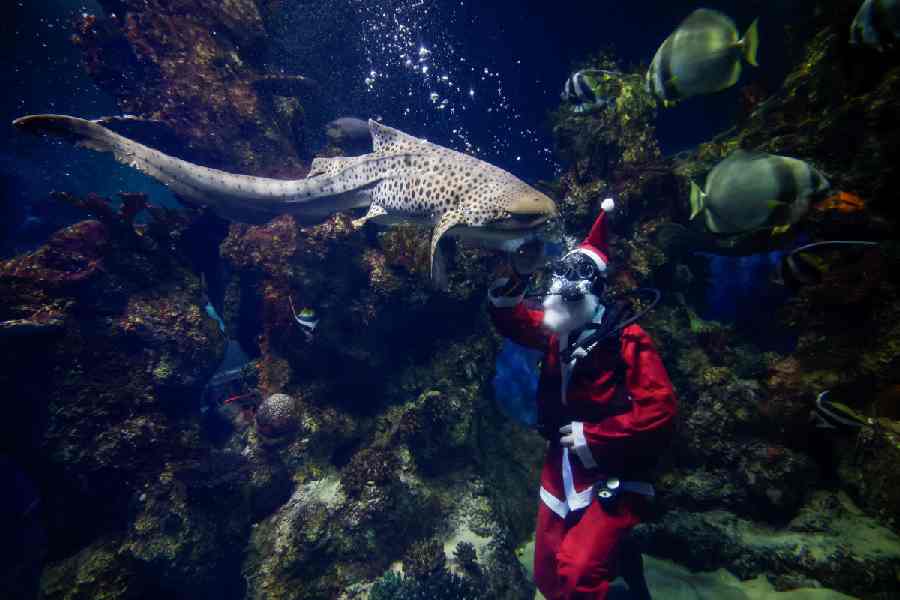 A diver dressed as Santa Claus feeds a zebra shark inside a fish tank at the Malta National Aquarium, in Qawra, Malta December 19, 2024. Reuters