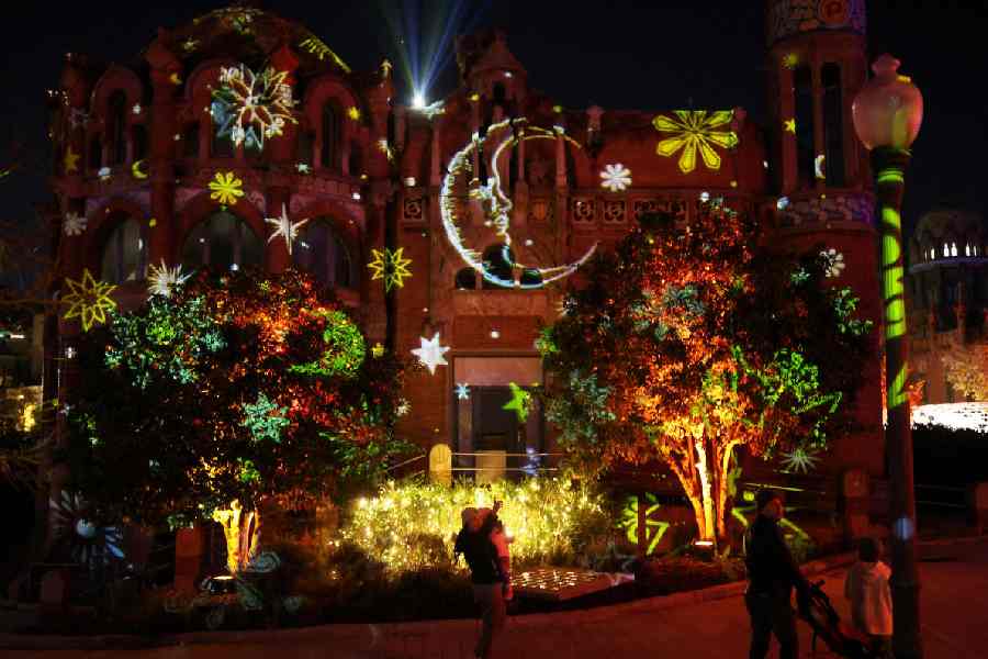 A family walks around Christmas lights inside of the former Hospital Santa Creu i Sant Pau, designed by Catalan Lluis Domenech i Montaner, which is a UNESCO World Heritage Site, during Christmas celebrations in Barcelona, Spain December 13, 2024. Reuters