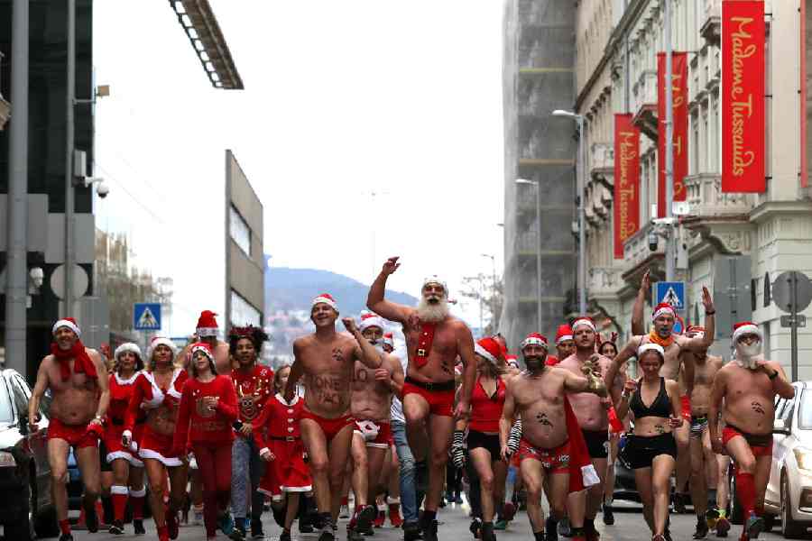 People take part in a half-naked Santa run in Budapest, Hungary, December 15, 2024. Reuters