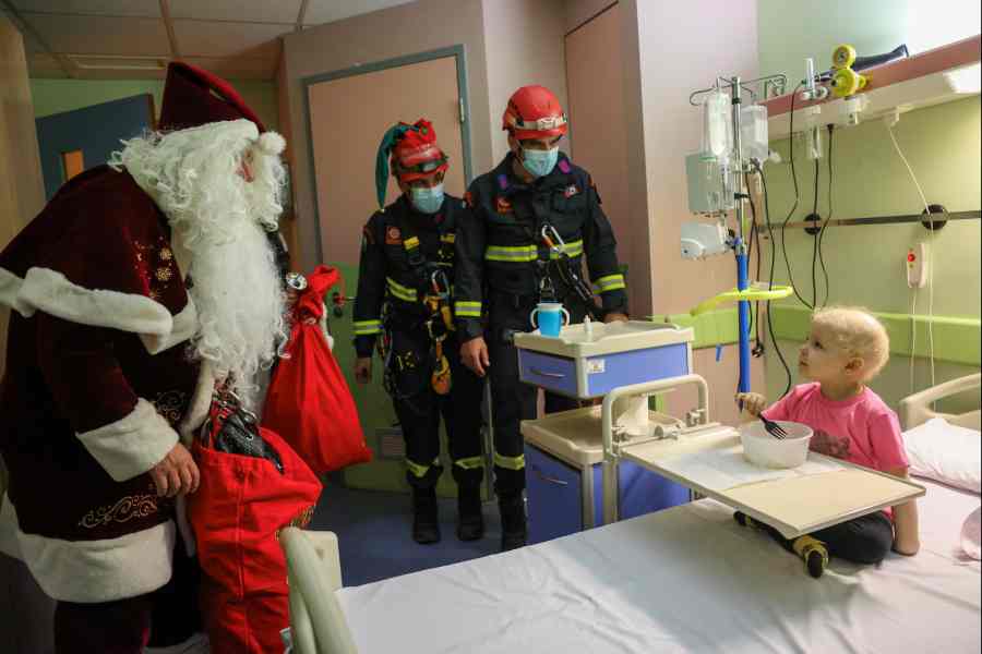 A Greek firefighter, dressed as Santa Claus, visits a young patient of the “Marianna V. Vardinoyiannis” Oncology unit of the Aghia Sofia Children’s Hospital in Athens, Greece, December 12. Reuters