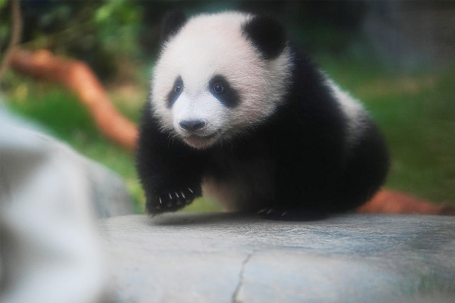 The panda carers said the female cub seemed more active than her male twin. She loves climbing the tree inside the enclosure and resting there while her brother likes to wander around and play with the plants. The male cub has been marked with two purple food-colouring spots on its back to distinguish it from his sister.
