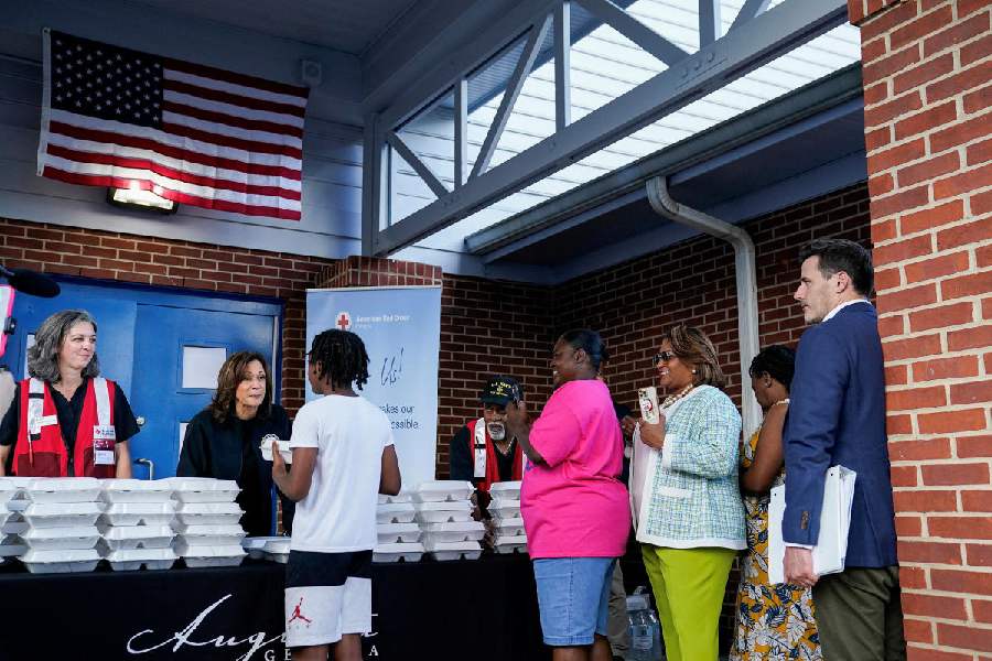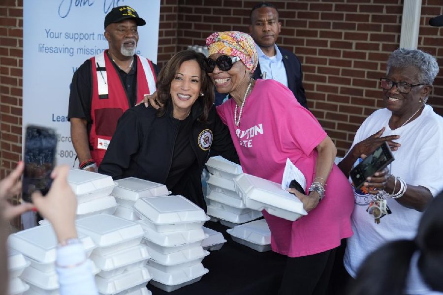 Harris, meanwhile, hugged and huddled with a family in hurricane-ravaged Augusta, Georgia.