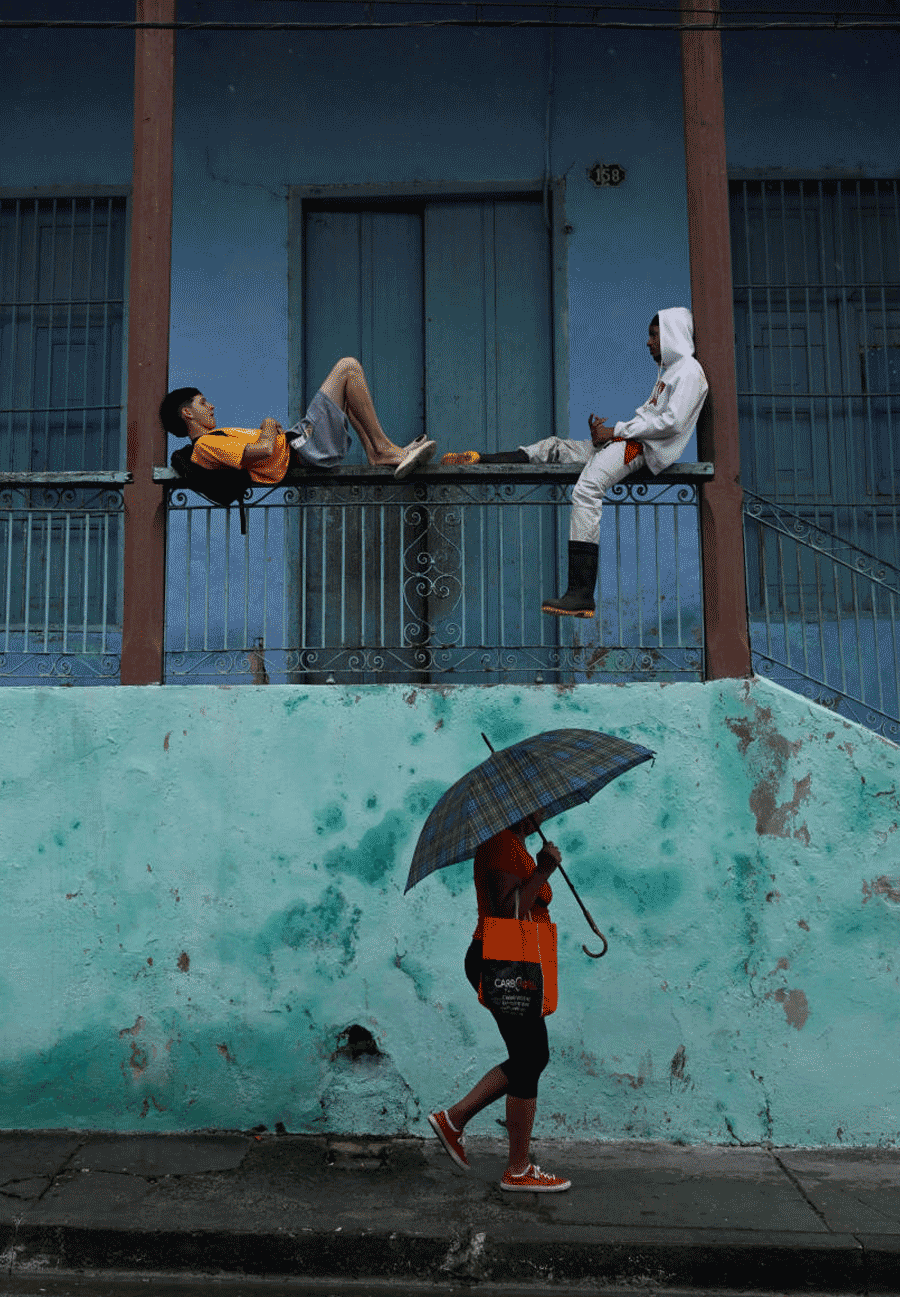 A woman holding an umbrella walks past two people on a porch ahead of Hurricane Melissa's landfall, in Santiago de Cuba, Cuba.
