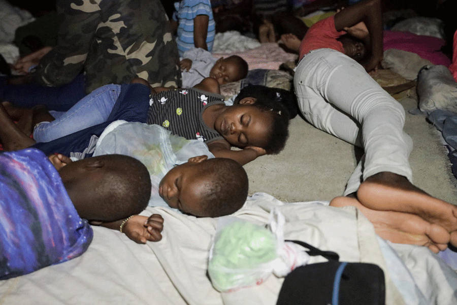 People sleep at a school turned shelter while Haiti is seeing downpours from the outer bands of Hurricane Melissa, as the storm is churning towards Cuba, after making landfall in Jamaica, in Les Cayes, Haiti.