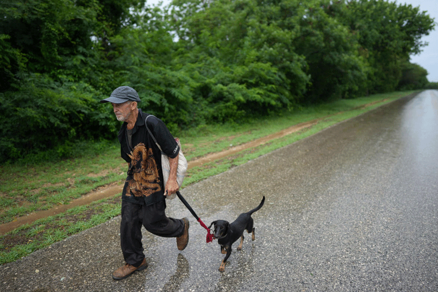 Jose Martinez, 70, walks his dog Trueno, or “Thunder” in Spanish, to a shelter ahead of Hurricane Melissa's landfall in Caleta Blanca, Cuba.