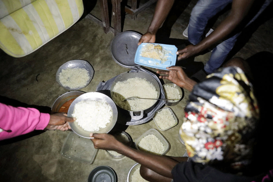 People receive food at a school turned shelter while Haiti is seeing downpours from the outer bands of Hurricane Melissa, as the storm is churning towards Cuba, after making landfall in Jamaica, in Les Cayes, Haiti.