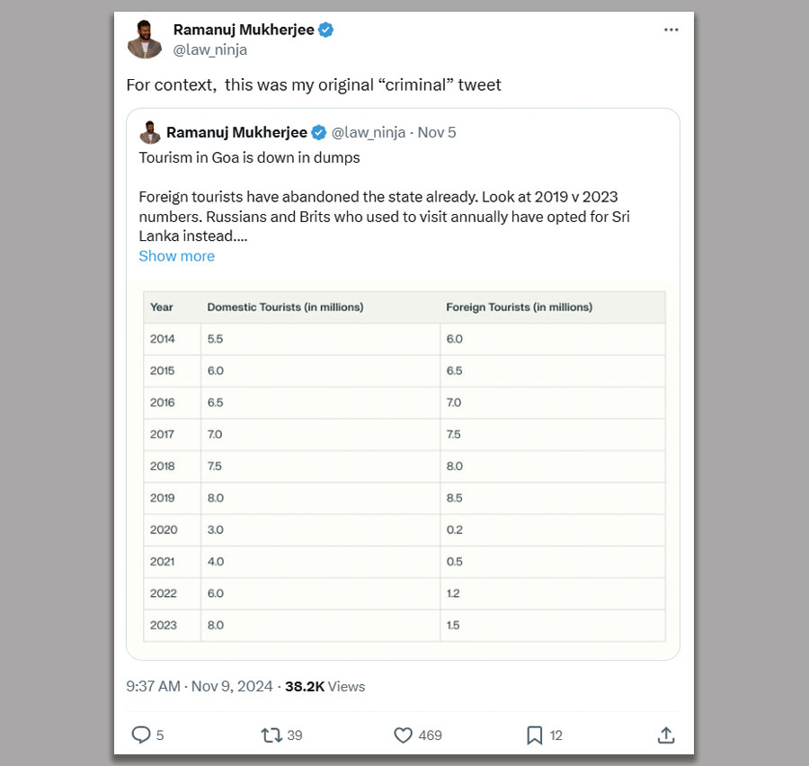 Ramanuj Mukherjee recently posted on his X (formerly Twitter) data on Goa’s foreign tourist arrivals and raised questions about the state’s tourism industry.