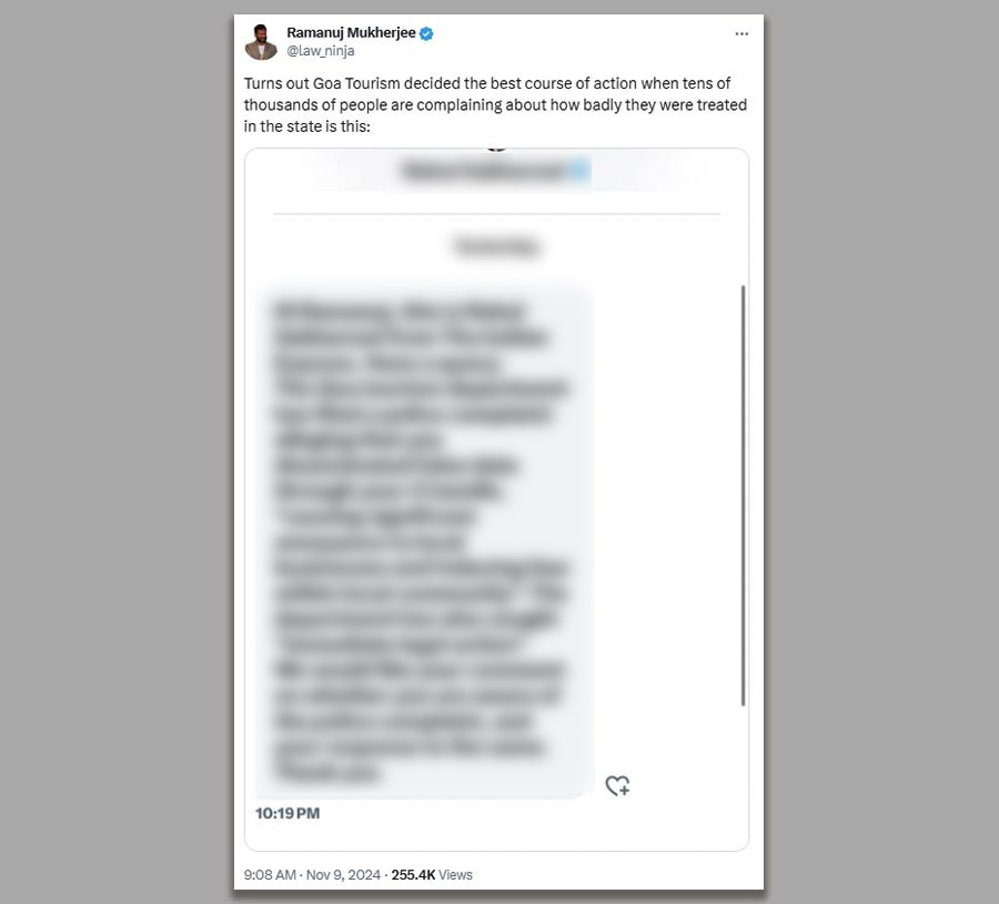 “This appears to be an assumption at this point. If they feel the data is incorrect, they have to put out the right data. They can even post the right data on X. Also, the Goa tourism department should be a lot more concerned about what people are saying about their bad experience in the state rather than my alleged ‘wrong data’,” he said.