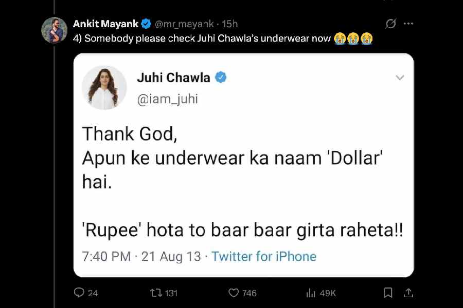 These resurfaced with rejoinders: “Somebody please check Juhi Chawla’s underwear now,” and “Has she stopped tying Rakhee to Dollar nowadays?”