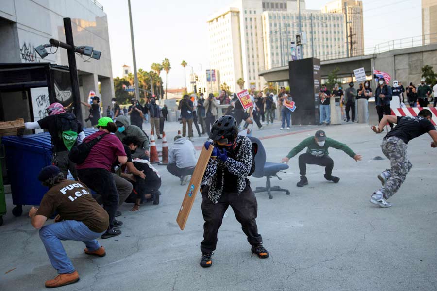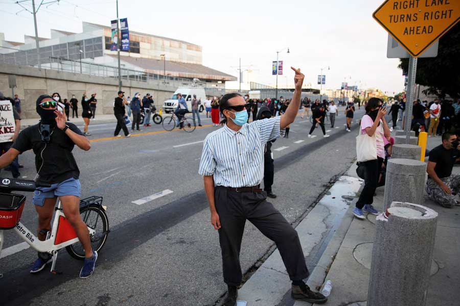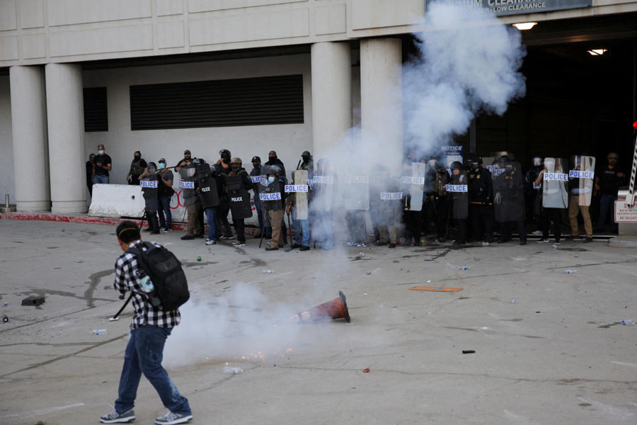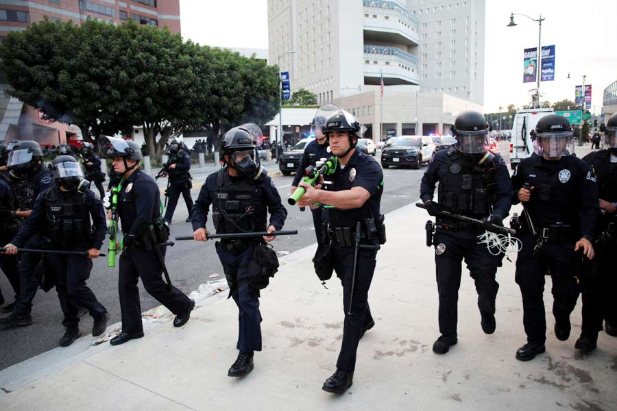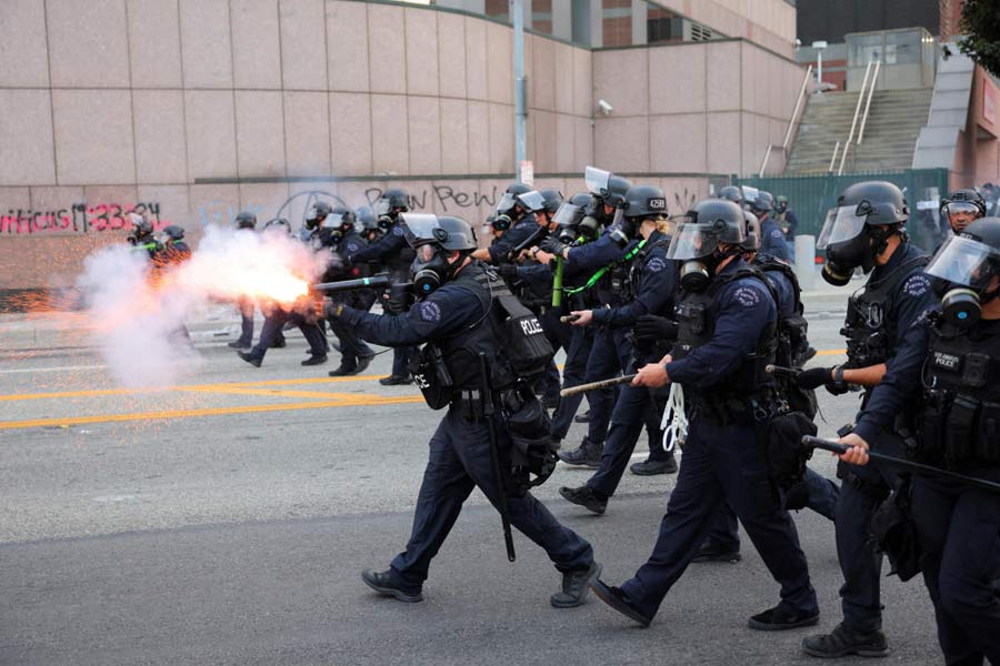 Live Reuters video showed Los Angeles Police Department officers lined up on a downtown street wielding batons and what appeared to be tear gas rifles, facing off with demonstrators after authorities had ordered crowds of protesters to disperse around nightfall.