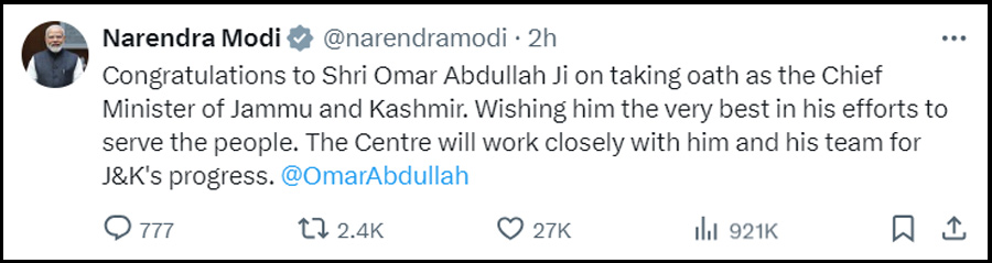 “Congratulations to Shri Omar Abdullah Ji on taking oath as the Chief Minister of Jammu and Kashmir. Wishing him the very best in his efforts to serve the people. The Centre will work closely with him and his team for J&K’s progress.” The PM posted on X.