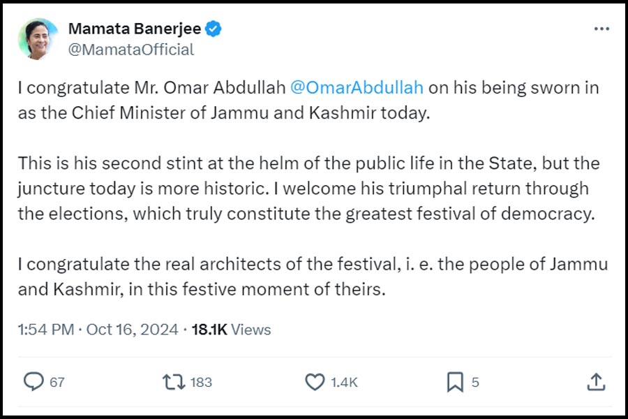 I congratulate Mr Omar Abdullah @OmarAbdullah on his being sworn in as the Chief Minister of Jammu and Kashmir today. This is his second stint at the helm of public life in the state, but the juncture today is more historic,” Banerjee posted on her X handle.