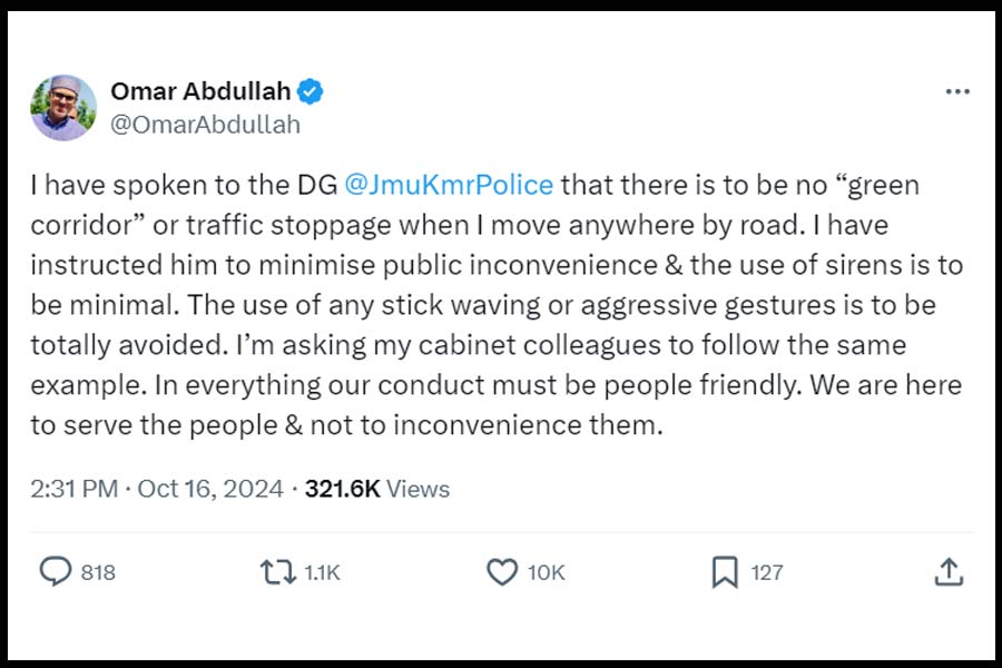 “I have spoken to the DG @JmuKmrPolice that there is to be no “green corridor” or traffic stoppage when I move anywhere by road. I have instructed him to minimise public inconvenience & the use of sirens is to be minimal.” Abdullah posted on his X (Twitter) handle.