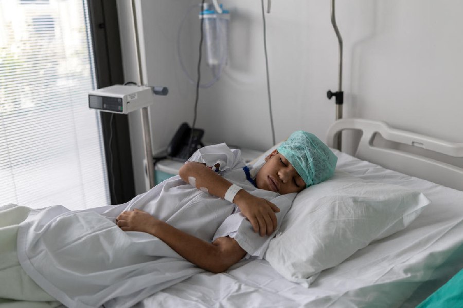 Syrian refugee Yahia Aldarwish, 10, lies on a hospital bed ahead of a kidney transplant at the Onassis National Transplant Center in Athens, Greece.