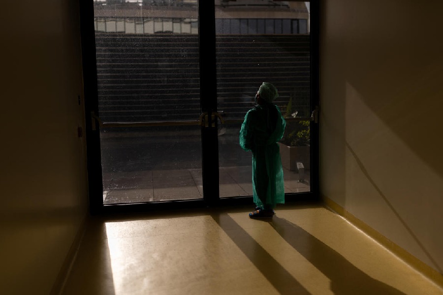 Syrian refugee Yahia Aldarwish, 10, looks outside a door at the Onassis National Transplant Center following a successful kidney transplant with his father as donor, in Athens, Greece.