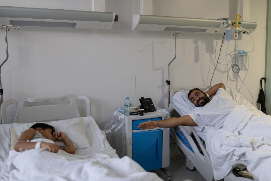 Syrian refugee Abdulaziz Aldarwish, 32, reaches out his hand towards his son Yahia Aldarwish, 10, from his hospital bed shortly before a kidney transplant in which Abdulaziz is the donor, at the Onassis National Transplant Center, in Athens, Greece.