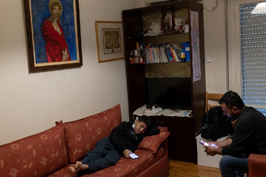 Syrian refugee Yahia Aldarwish, 10, sits with his father Abdulaziz Aldarwish, 32, at hospital-provided accommodation ahead of a kidney transplant with his father as donor, in Athens, Greece.