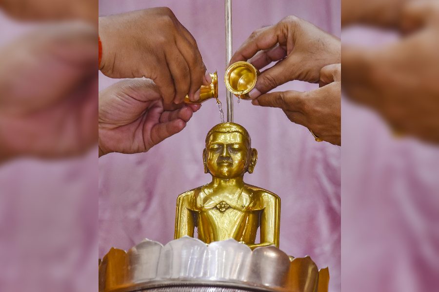 Jain devotees perform 'abhishek' of Lord Mahavir on the occasion of Mahavir Jayanti, in Ranchi, Jharkhand. Mahavir Jayanti marks the birth anniversary of Lord Mahavir, the 24th Tirthankara of Jainism.