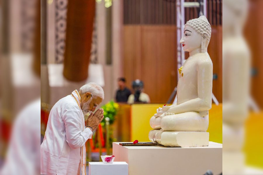 Prime Minister Narendra Modi offers prayers to Lord Mahavira during inauguration of the 2550th Bhagwan Mahavir Nirvan Mahotsav at Bharat Mandapam, in New Delhi. "Lord Mahavir's message of peace, restraint and harmony are an inspiration for the country in building a 'Viksit Bharat'," Modi said.