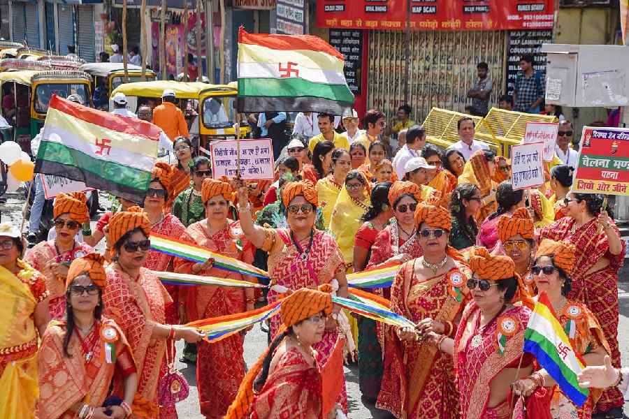 Jain community members take part in a religious procession on the Mahavir Jayanti, in Patna. The idol of Mahavira is carried out on a chariot, in a procession called rath yatra.