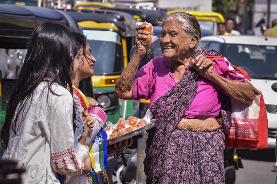Jain devotees distribute 'Laddoo' on Mahavir Jayanti, in Surat. During the day, most members of the Jain community engage in some sort of charitable act, prayers, pujas, and vratas.