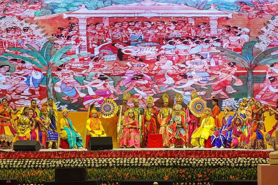 Artists perform during inauguration of the 2550th Bhagwan Mahavir Nirvan Mahotsav at Bharat Mandapam, in New Delhi.
