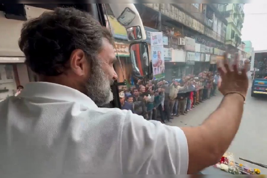 Rahul Gandhi waves to people from a bus. The Yatra will continue by bus at Gokshadanga before reaching Falakata in Alipurduar district for an overnight halt.