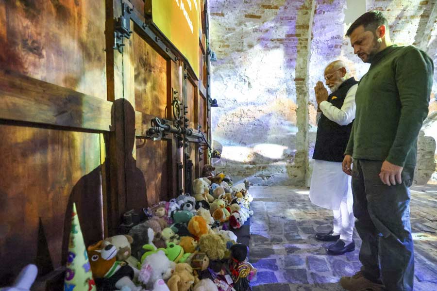 With folded hands, Modi offered a silent prayer before placing a small toy (a doll) at the memorial as the Ukrainian President placed a teddy bear.