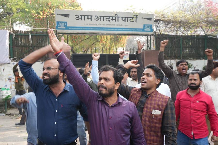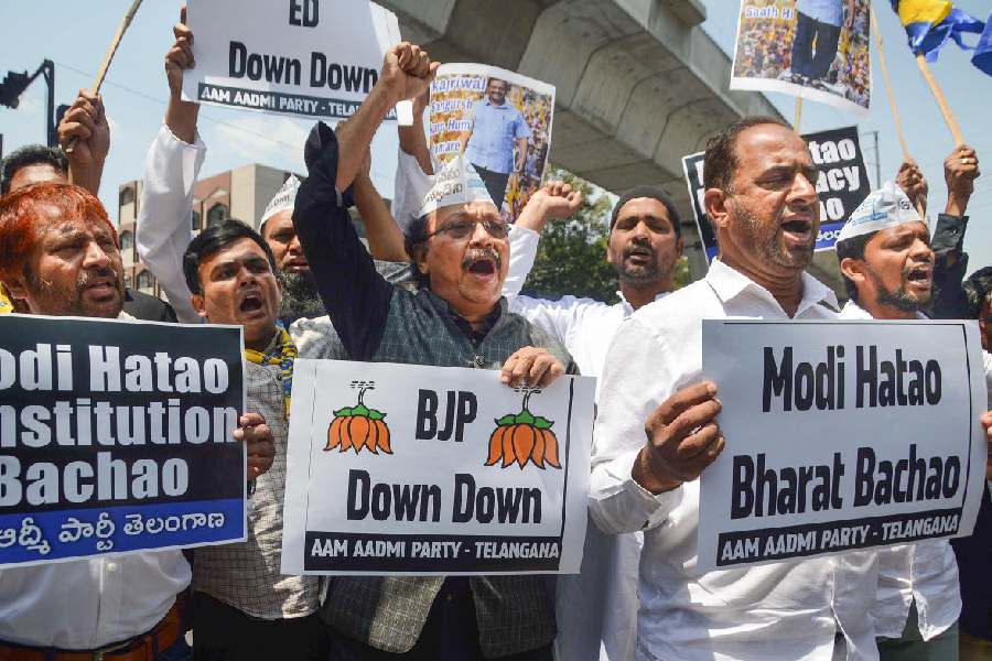 AAP supporters raise slogans against the arrest of Delhi Chief Minister Arvind Kejriwal by the Enforcement Directorate (ED) in the money laundering case linked to alleged irregularities in the scrapped Delhi excise policy 2021-22, outside the party office, in New Delhi.