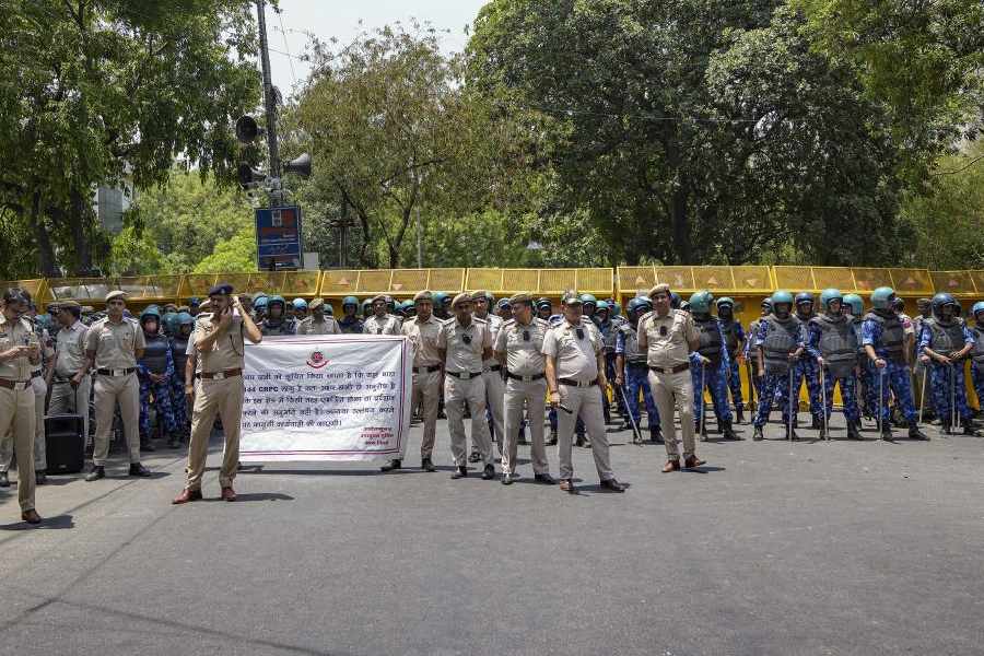 Police personnel stand guard during AAP's protest march against the arrest of party leaders. Delhi Police has beefed up security in and around the BJP headquarters in view of the protest even as police said the party has not sought permission for the demonstration.