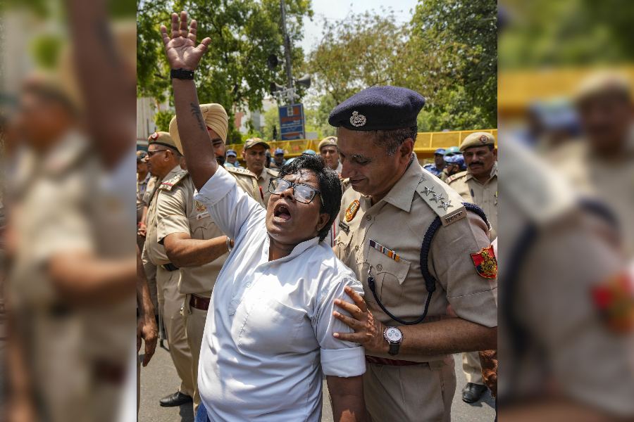 Police detain an AAP supporter during a protest march towards BJP HQ against the arrest of party leaders.