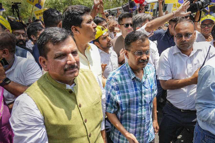 Delhi CM and AAP convenor Arvind Kejriwal and party MP Sanjay Singh during a protest march.