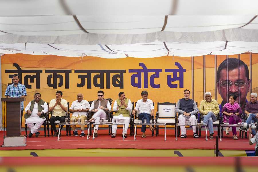 Delhi CM and AAP convenor Arvind Kejriwal addresses party workers ahead of a protest march towards BJP HQ against the arrest of party leaders, in New Delhi. Kejriwal, who is out on interim bail in the excise policy case, had said on May 18 that he and other AAP leaders would go to the BJP headquarters on May 19 'so that the prime minister can send anyone he wishes to jail'.