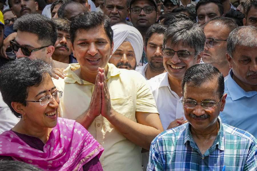 Delhi CM and AAP convenor Arvind Kejriwal with party leaders Atishi and Saurabh Bhardwaj during a protest march towards BJP HQ against the arrest of party leaders