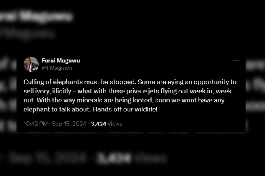 “Culling of elephants must be stopped,” Farai Maguwu, executive director of the Centre for Natural Resource Governance, a civil society outfit in Zimbabwe, wrote on X. “Some are eying an opportunity to sell ivory, illicitly - what with these private jets flying out week in, week out. With the way minerals are being looted, soon we wont have any elephant to talk about. Hands off our wildlife!”