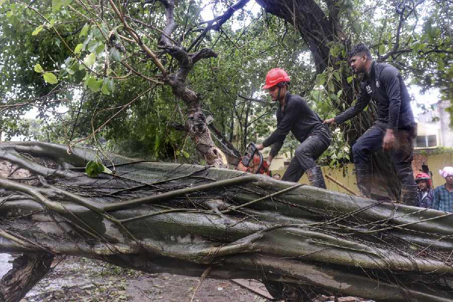 Workers clear a road blocked by an uprooted tree following the landfall of Cyclone Remal, in Guwahati. Trees were uprooted in several places across Assam, including Guwahati, because of the strong winds. Power supply was disrupted in lower Assam as electric poles fell, and water-logging was reported from different towns, officials said.