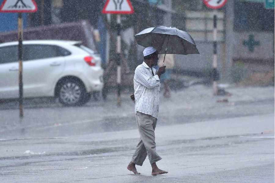 A man holding umbrella crosses a road as it rains after the landfall of the Cyclone Remal, in Nagaon district of Assam. The India Meteorological Department (IMD) warned of extremely heavy rainfall across North East as an impact of the cyclone. In manipur, heavy train triggered a mudslide near Sinam village in Kangpokpi district on NH 37 Imphal-Silchar highway sweeping off a truck into a gorge.
