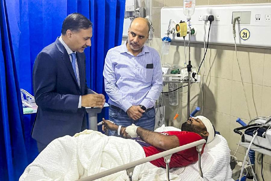 Ambassador of India to Kuwait Adarsh Swaika visits a hospital where workers who suffered injuries in a fire that broke out in a building have been admitted, in Mangaf, Kuwait, Wednesday, June 12, 2024. Kerala is also sending state health minister Veena George to Kuwait to coordinate efforts to provide treatment to those injured and bring back the bodies of those who died.