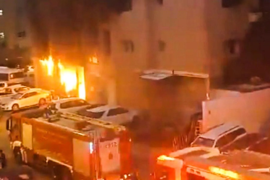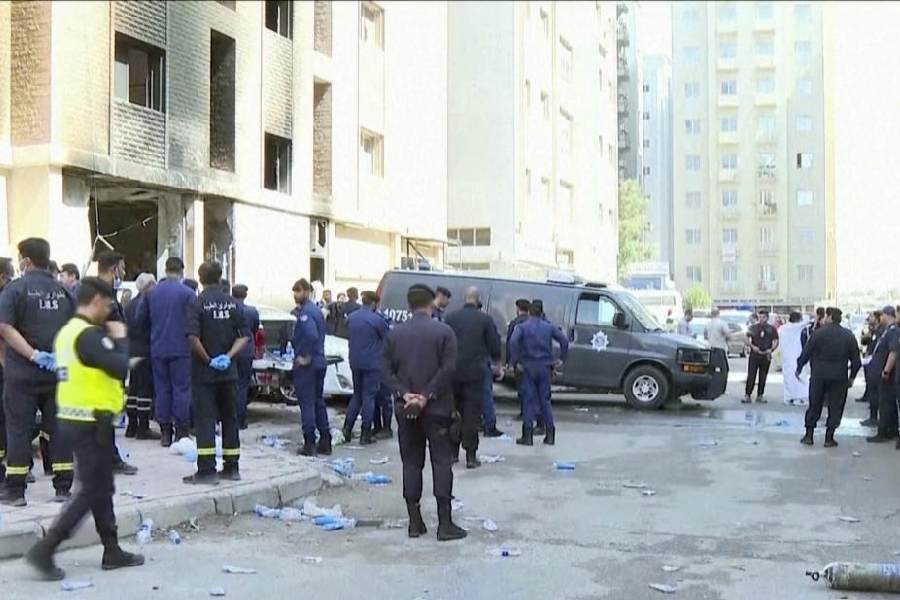 Rescuers arrive at the site of a building that caught fire in Kuwait, Wednesday, June 12, 2024. Kuwait's Interior Minister, Sheikh Fahad Al-Yousuf Al-Sabah, has ordered an investigation into the incident and directed the apprehension of the building's owner and janitor. Five Tamils were also among the dead, PTI quoted Gingee KS Masthan, Tamil Nadu minister for minorities and non-resident Tamils welfare, as having said.
