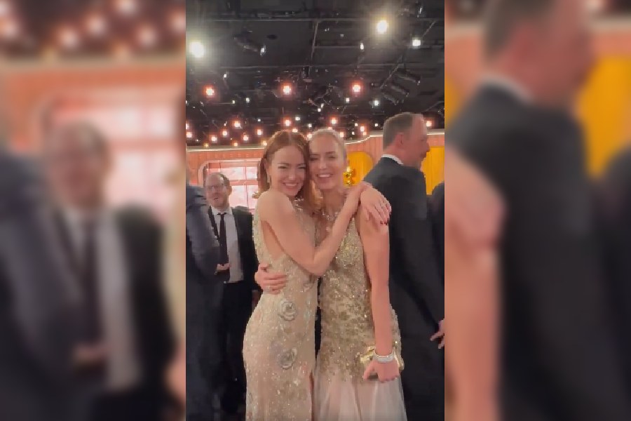 Emma Stone and Emily Blunt at the Golden Globe Awards. Emma Stone won the Best Actress award in a musical or comedy for her role in 'Poor Things'. Emily Blunt wore a gold and white tulle Alexander McQueen dress with Tiffany & Co. jewellery.