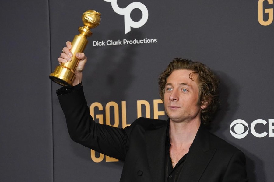 Jeremy Allen White poses in the press room with the award for best performance by an actor in a television series, musical or comedy for "The Bear" at the 81st Golden Globe Awards. Jeremy Allen White wore a custom black Calvin Klein tuxedo consisting of a double-breasted wool jacket with satin grosgrain lapels, high-waisted trousers and a sheer silk voile shirt.