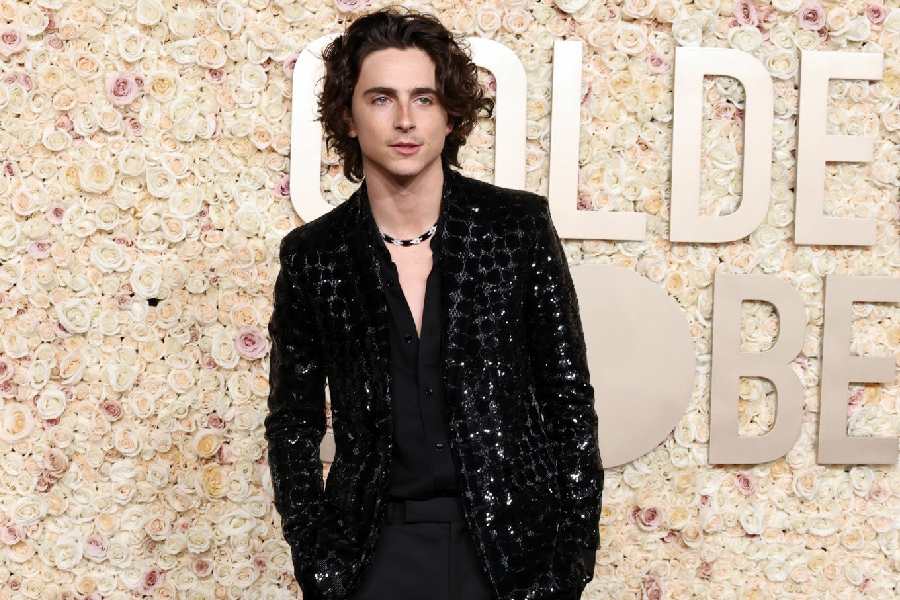Timothée Chalamet wore an all-black Celine Homme number with a touch of shimmer and sparkle.