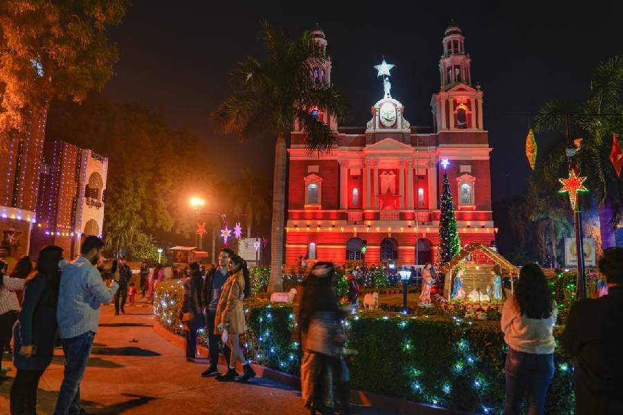 People visit the illuminated Sacred Heart Cathedral Church on Christmas eve, in New Delhi.