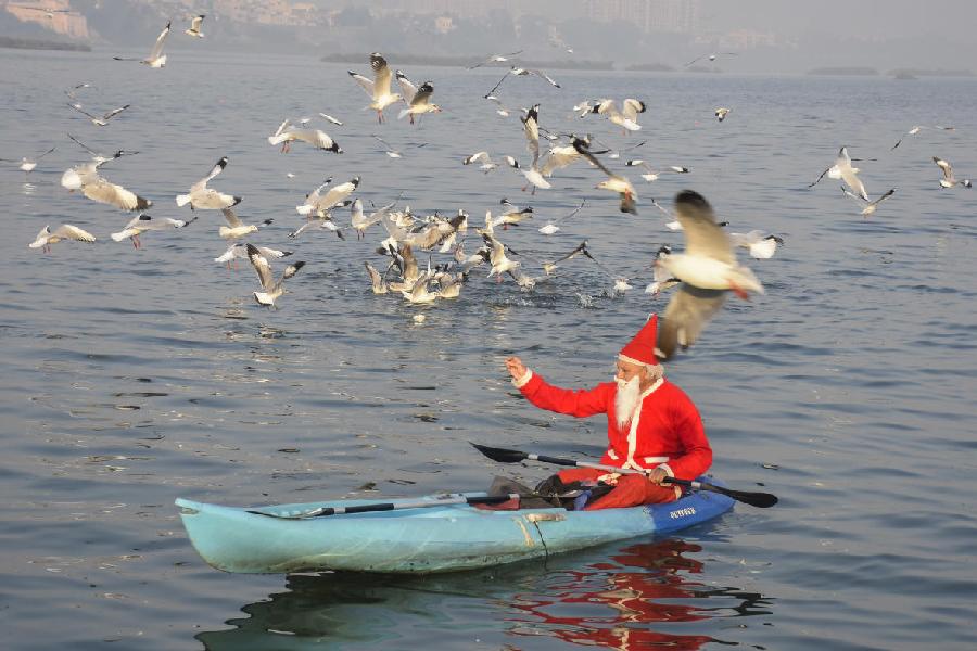 A man dressed as Santa Claus feeds seagulls on Tapi river, ahead of Christmas, in Surat.